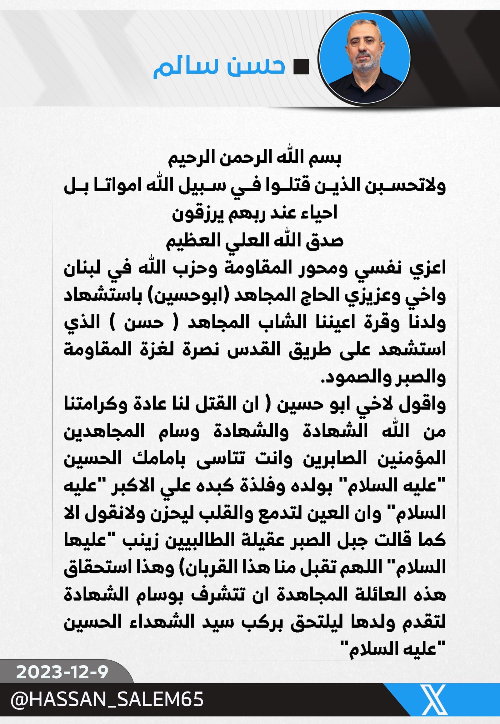 و قال سالم في تدوينة على موقع “أكس” : اعزي نفسي ومحور المقاومة وحزب الله في لبنان واخي وعزيزي الحاج المجاهد (ابوحسين) باستشهاد ولدنا وقرة اعيننا الشاب المجاهد ( حسن ) الذي استشهد على طريق القدس نصرة لغزة المقاومة والصبر والصمود.
