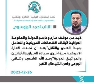 و قال الموسوي، في تدوينة على موقع “أكس” ، انه : لابدَ من موقف حازم وحاسم للدولة والحكومة العراقية لأيقاف الانتهاكات الامريكية والتعامل بمبدأ العدو و القاتل بعد ان تحدت الادارة الامريكية مرة اخرى سيادة العراق والقوانين والمواثيق الدولية.