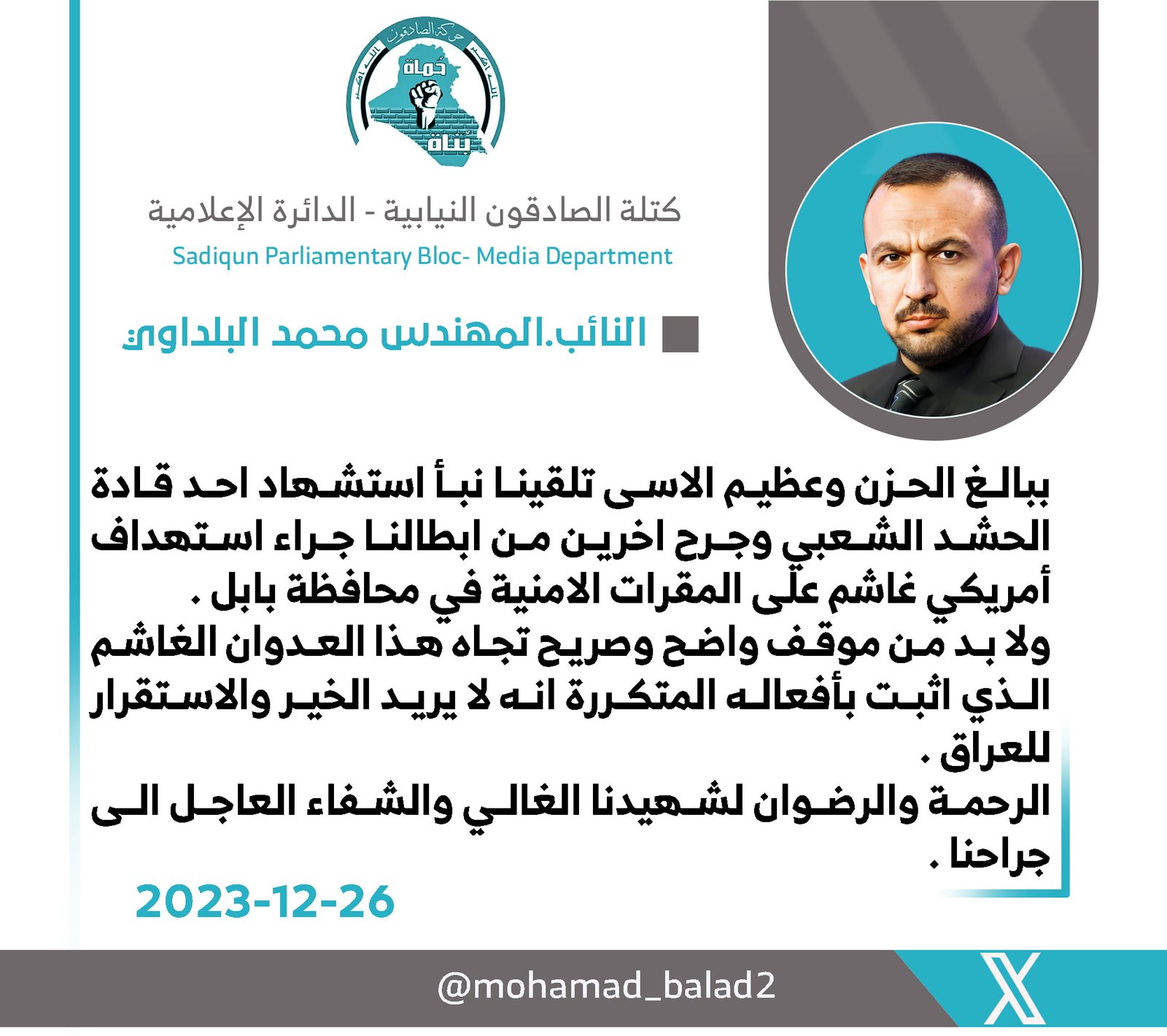 و قال البلداوي في تغريدة على منصة “أكس” ، انه: ببالغ الحزن وعظيم الاسى تلقينا نبأ استشهاد احد قادة الحشد الشعبي وجرح اخرين من ابطالنا جراء استهداف أمريكي غاشم على المقرات الامنية في محافظة بابل .