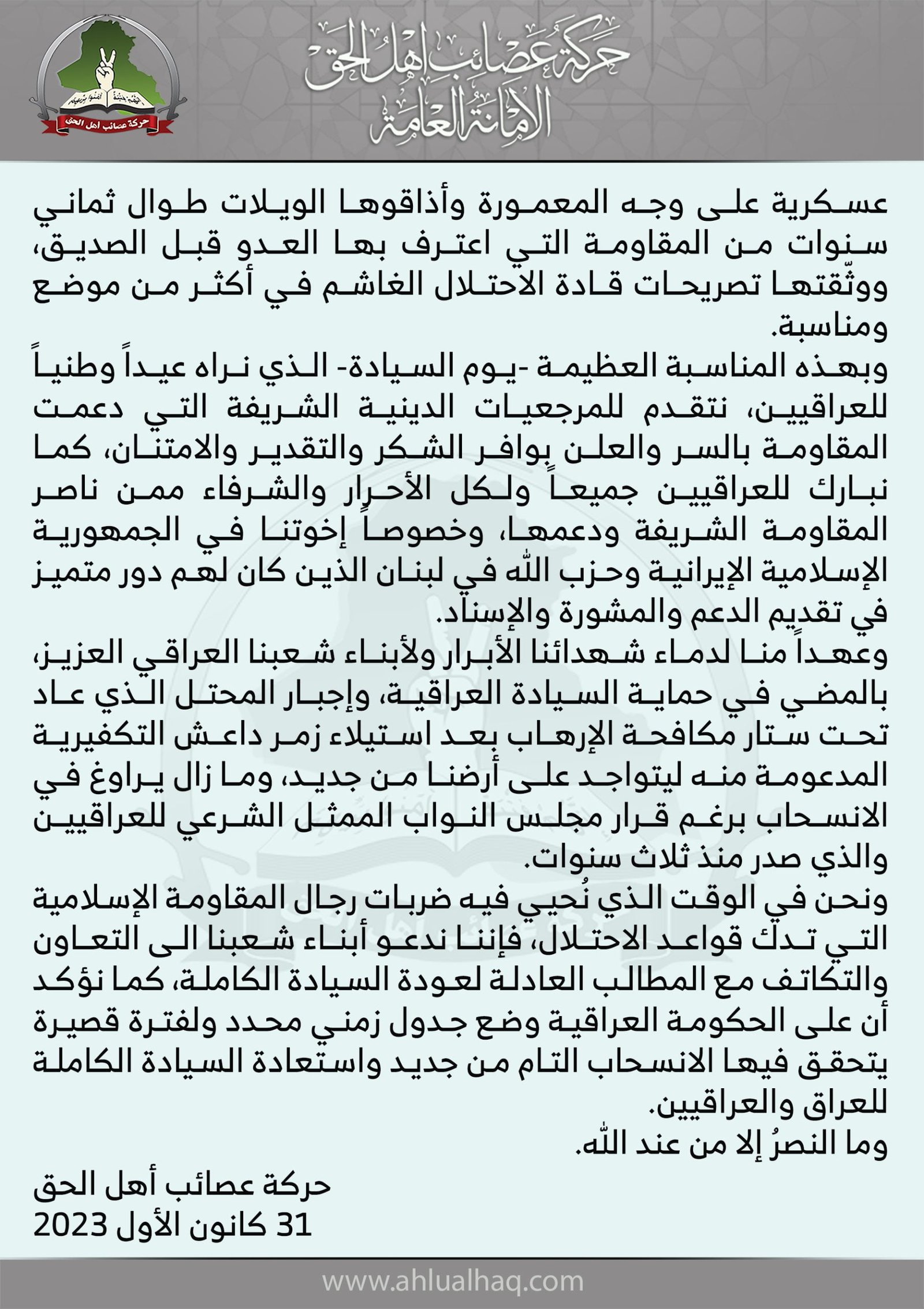 حركة عصائب أهل الحق تؤكد رفضها التدخلات الخارجية وتمسكها بالسيادة والاستحقاقات الدستورية