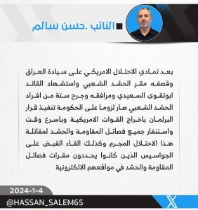 و قال سالم في تدوينة على موقع “أكس” ، انه بعد تمادي الاحتلال الامريكي على سيادة العراق وقصفه مقر الحشد الشعبي واستشهاد القائد ابوتقوى السعيدي ومرافقه وجرح ستة من افراد الحشد الشعبي صار لزوما على الحكومة تنفيذ قرار البرلمان باخراج القوات الامريكية وباسرع وقت .