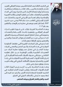 وأضاف سماحته : انه بهذه المناسبة العزيزة، نؤكد على ضرورة تطوير قدرات الجيش العراقي، وتجهيزه بأحدث الأسلحة والمعدات، وخصوصاً في مجال الدفاع الجوي، لحفظ أمن وسيادة العراق، كما ندعو إلى مزيد من الاهتمام بعوائل الشهداء والجرحى والمصابين وذوي الإعاقة منهم بالذات”.