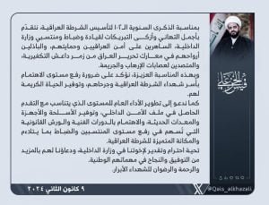 الشيخ الخزعلي يهنى الشرطة العراقية بعيد تأسيسها و يشيد بتضحيات أبنائها بمحاربة الأرهاب