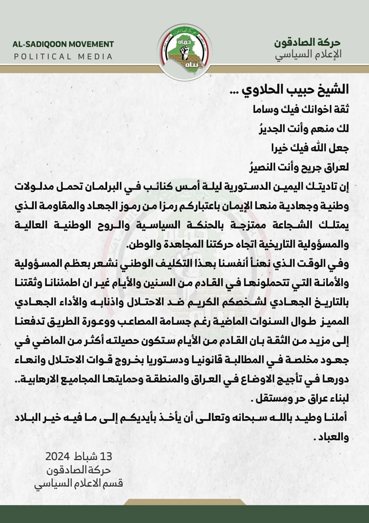 و ذكر بيان لقسم الإعلام السياسي في حركة الصادقون، مخاطباً الشيخ حبيب الدليمي بالقول: إن تاديتك اليمين الدستورية ليلة أمس كنائب في البرلمان تحمل مدلولات وطنية وجهادية منها الإيمان باعتباركم رمزا من رموز الجهاد والمقاومة الذي يمتلك الشجاعة ممتزجة بالحنكة السياسية والروح الوطنية العالية والمسؤولية التاريخية اتجاه حركتنا المجاهدة والوطن.