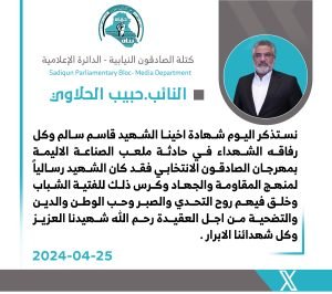 الحلاوي يستذكر بحزن شهداء الحادث الأليم الذي وقع في ملعب الصناعة خلال المهرجان الأنتخابي لكتلة الصادقون