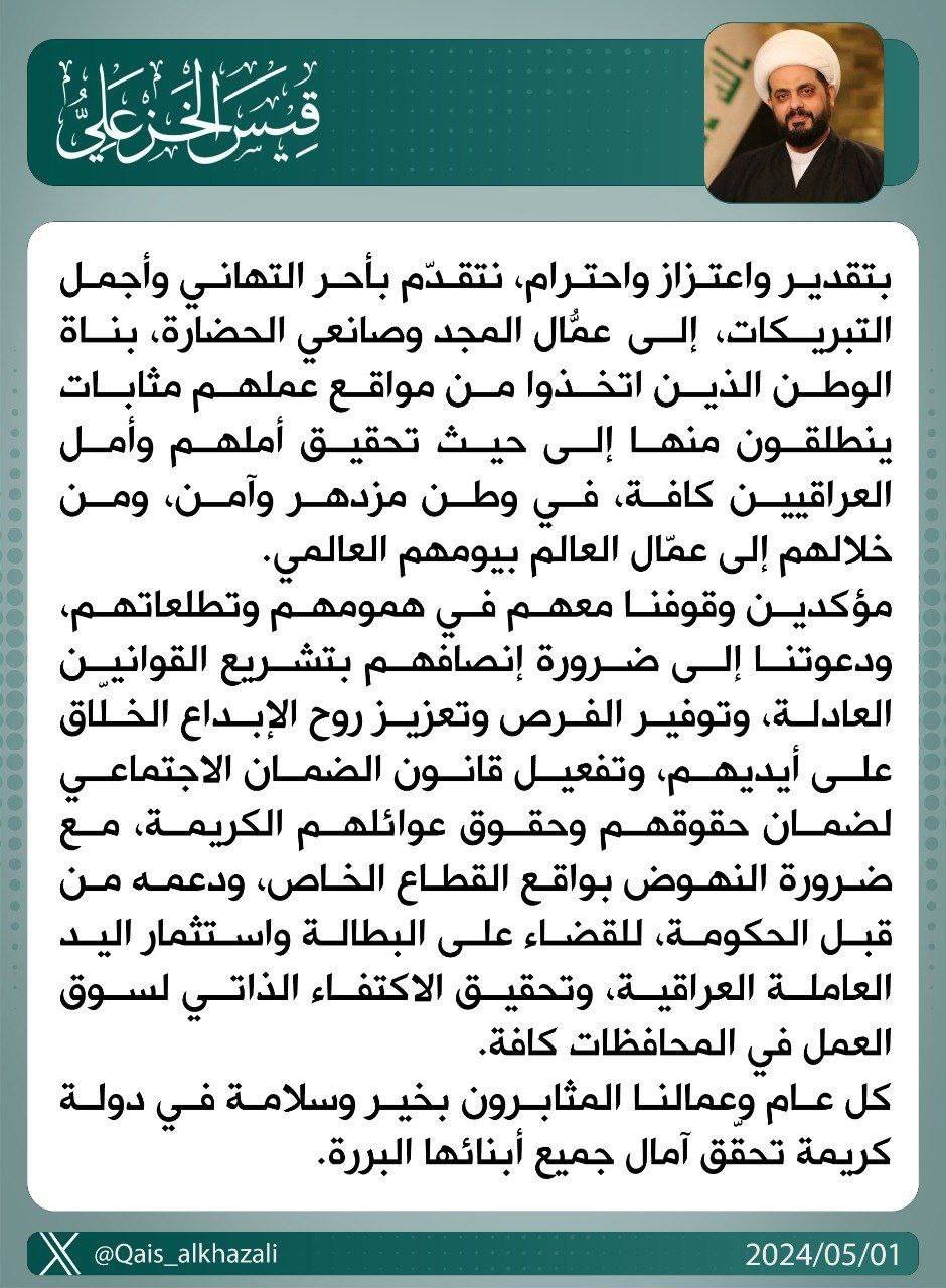 و قال الشيخ الخزعلي في تدوينة على منصة “أكس” ، أنه: بتقدير واعتزاز واحترام، نتقدّم بأحر التهاني وأجمل التبريكات، إلى عمّال المجد وصانعي الحضارة، بُناة الوطن الذين اتخذوا من مواقع عملهم مثابات ينطلقون منها إلى حيث تحقيق أملهم وأمل العراقيين كافة، في وطن مزدهر وآمن، ومن خلالهم إلى عمّال العالم بيومهم العالمي.