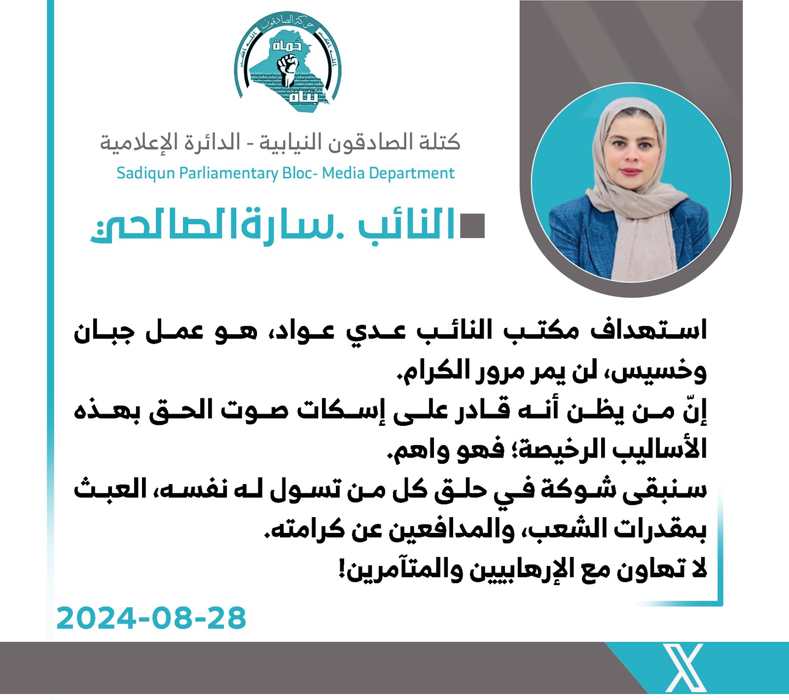 النائب سارة الصالحي تصف أستهداف مكتب النائب عدي عواد بالعمل الجبان وهدفه أسكات صوت الحق