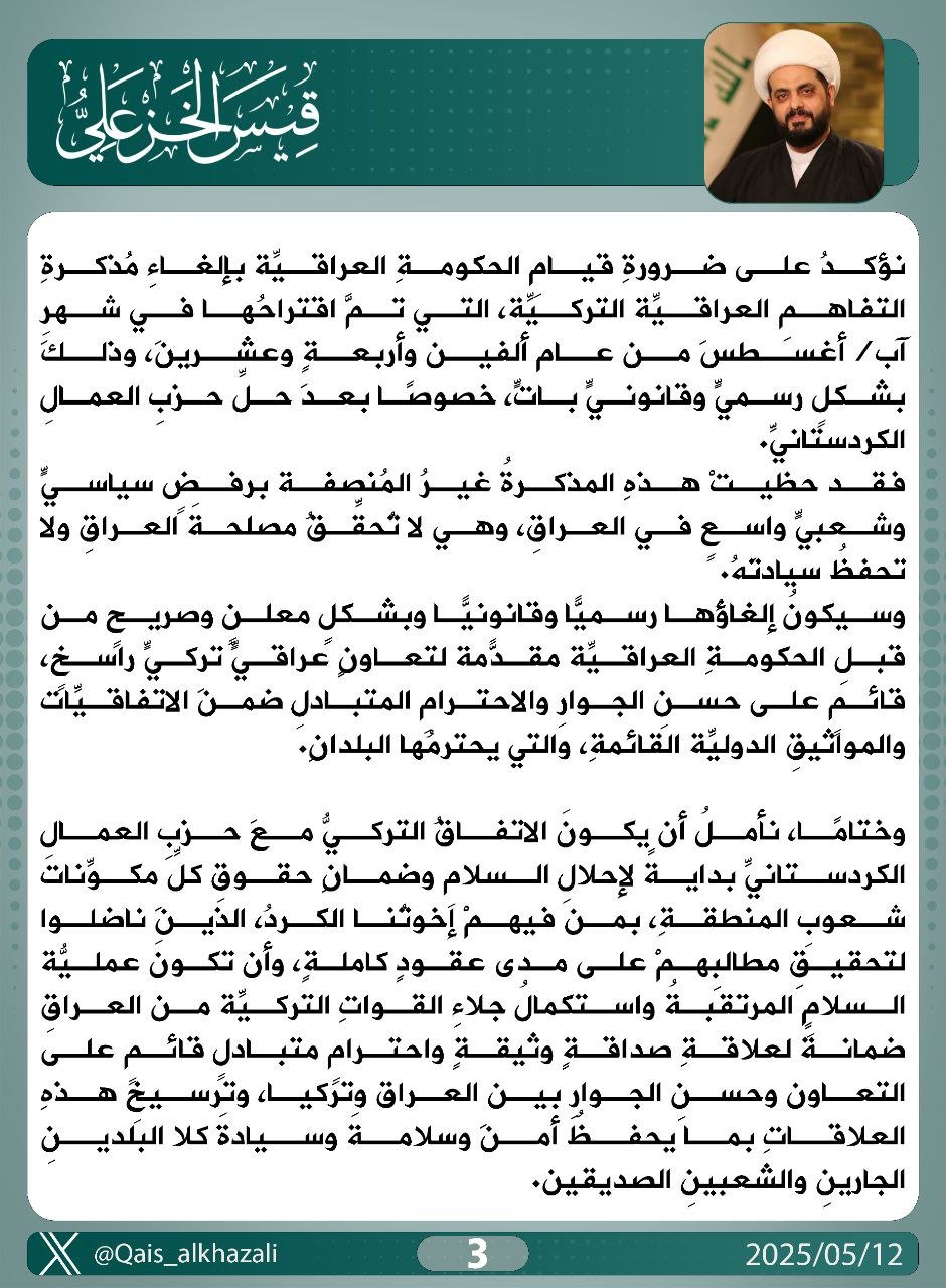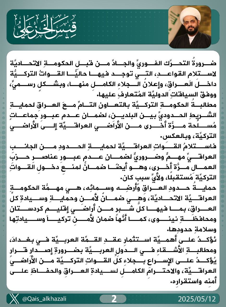 دعا الأمين العام لحركة عصائب أهل الحق، سماحة الشيخ قيس الخزعلي، اليوم الأثنين، الحكومة العراقية والبرلمان العراقي الى اتخاذ خطوات عاجلة وحاسمة لضمان سيادة العراق، وعلى رأسها الشروع الفوري في إنهاء الوجود العسكري التركي على الأراضي العراقية ، وذلك عقب إعلان حزب العمال الكردستاني حلّ نفسه وإلقاء السلاح، بناءً على مبادرة زعيمه السيد عبد الله أوجلان، فيما عد الأمر خطوة تاريخية نحو إنهاء أكثر من أربعة عقود من الصراع المسلح مع الحكومات التركية المتعاقبة، والذي أودى بحياة عشرات الآلاف من الضحايا.