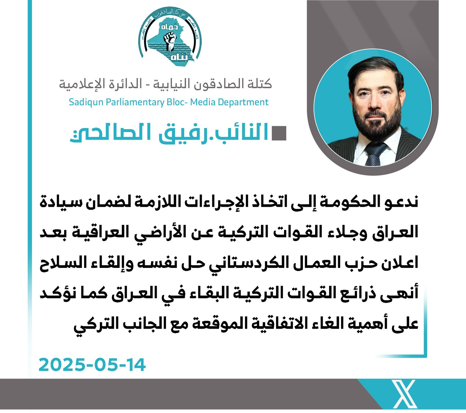 وقال الصالحي في تدوينة عبر منصة “أكس” ، إن “إعلان حزب العمال الكردستاني حل نفسه أنهى ذرائع القوات التركية للبقاء داخل الأراضي العراقية”، مشددًا على ضرورة “تحرك الحكومة بشكل عاجل لضمان سيادة البلاد وخروج تلك القوات”.