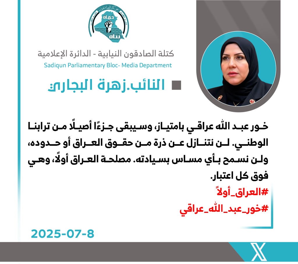 أكدت رئيس لجنة النقل والاتصالات النيابية عن كتلة الصادقون، النائب زهرة البجاري، اليوم الثلاثاء، أن “خور عبد الله عراقي بامتياز، وسيبقى جزءًا أصيلًا من التراب الوطني للبلاد .