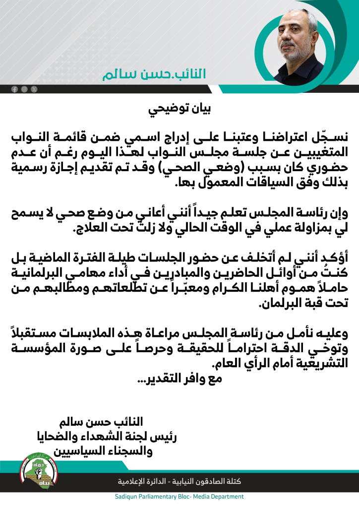 أصدر النائب عن كتلة الصادقون ورئيس لجنة الشهداء والضحايا والسجناء السياسيين، حسن سالم، بياناً توضيحياً عبّر فيه عن اعتراضه وعتبه على إدراج اسمه في قائمة النواب المتغيبين عن جلسة مجلس النواب التي عُقدت اليوم السبت، مؤكداً أن غيابه كان لأسباب صحية موثقة بإجازة رسمية قُدِّمت إلى رئاسة المجلس وفق السياقات المعمول بها.