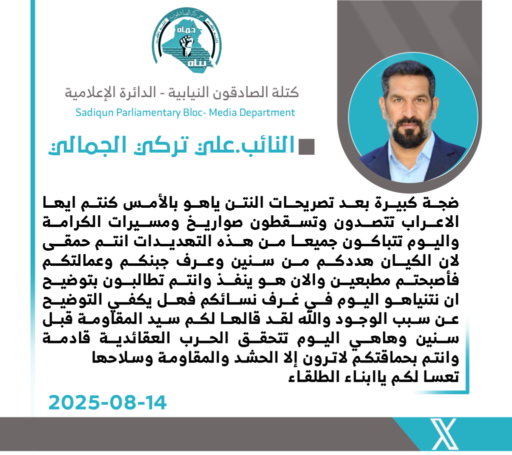 انتقد النائب عن كتلة الصادقون، علي تركي الجمالي،الخميس، مواقف بعض الدول العربية إزاء التصريحات الأخيرة لرئيس وزراء الكيان الصهيوني بنيامين نتنياهو، واصفاً ردود فعلها بـ”المتباكية” بعد أن كانت بالأمس تتصدى لصواريخ ومسيرات المقاومة.