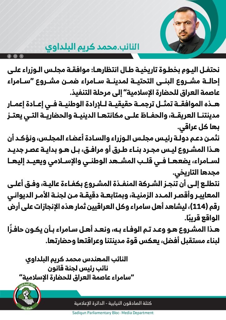 أكد المتحدث باسم كتلة الصادقون ونائب رئيس لجنة قانون “سامراء عاصمة العراق للحضارة الإسلامية”، المهندس محمد كريم البلداوي، اليوم الخميس، أن موافقة مجلس الوزراء على إحالة مشروع البنى التحتية لمدينة سامراء إلى مرحلة التنفيذ تمثل خطوة تاريخية طال انتظارها، وترجمة حقيقية للإرادة الوطنية في إعادة إعمار المدينة والحفاظ على مكانتها الدينية والحضارية التي يعتز بها كل العراقيين.