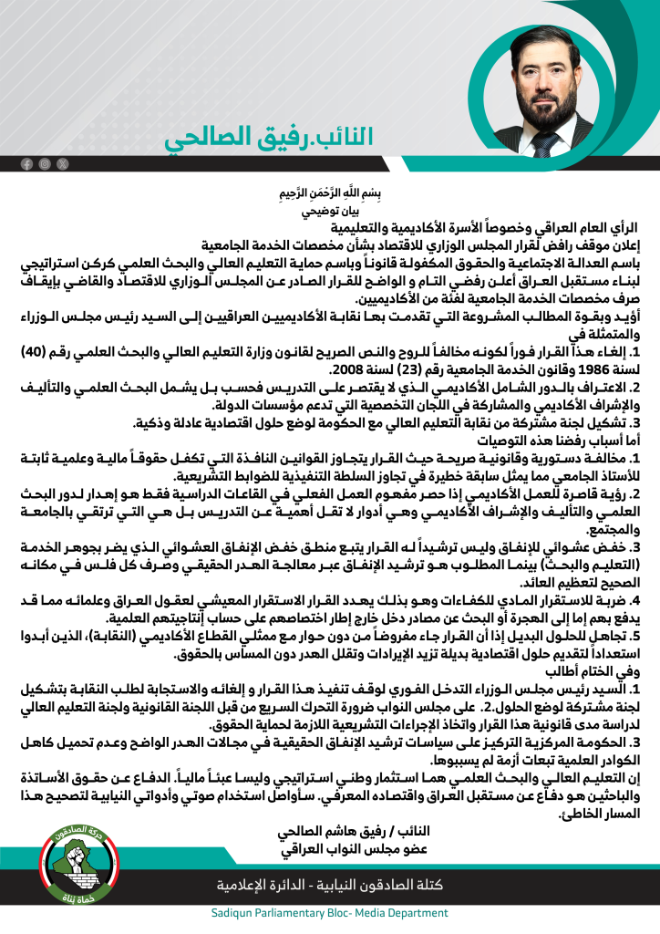 وأعرب عن دعمه الكامل للمطالب المشروعة التي تقدّمت بها نقابة الأكاديميين العراقيين إلى رئيس مجلس الوزراء، والتي تضمنت إلغاء القرار، والاعتراف بالدور الشامل للأستاذ الجامعي الذي لا يقتصر على التدريس فقط، بل يشمل البحث العلمي والتأليف والإشراف الأكاديمي والمشاركة في اللجان التخصصية الداعمة لمؤسسات الدولة، فضلاً عن تشكيل لجنة مشتركة بين النقابة والحكومة لوضع حلول اقتصادية عادلة وذكية.