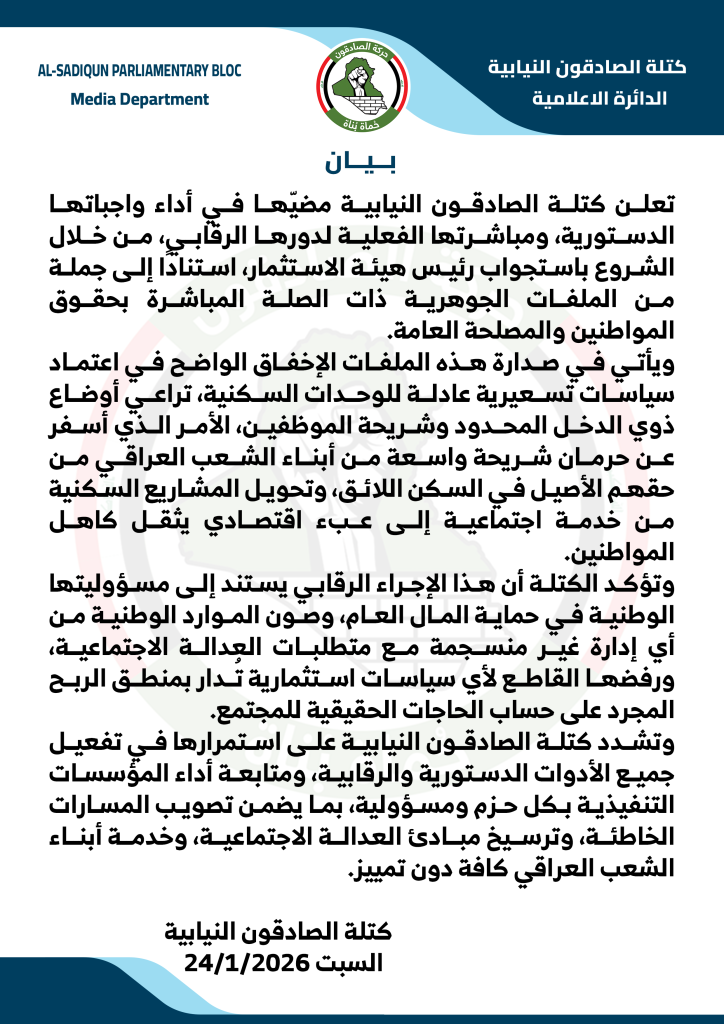 وأكدت كتلة الصادقون أن هذا الإجراء الرقابي يأتي انطلاقًا من مسؤوليتها الوطنية في حماية المال العام وصون الموارد الوطنية من أي إدارة لا تنسجم مع متطلبات العدالة الاجتماعية، مشددة على رفضها القاطع لأي سياسات استثمارية تُدار بمنطق الربح المجرد على حساب الحاجات الحقيقية للمجتمع.